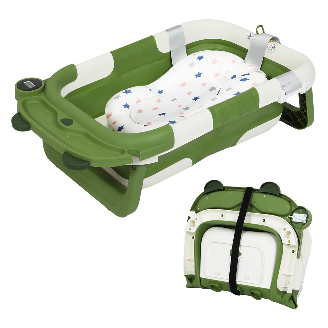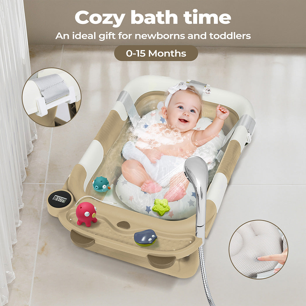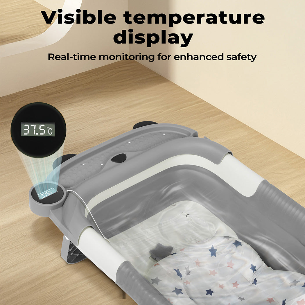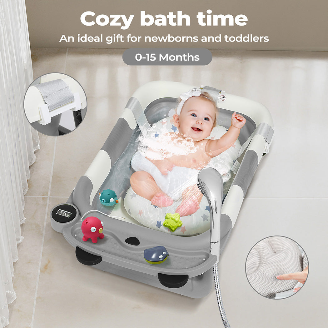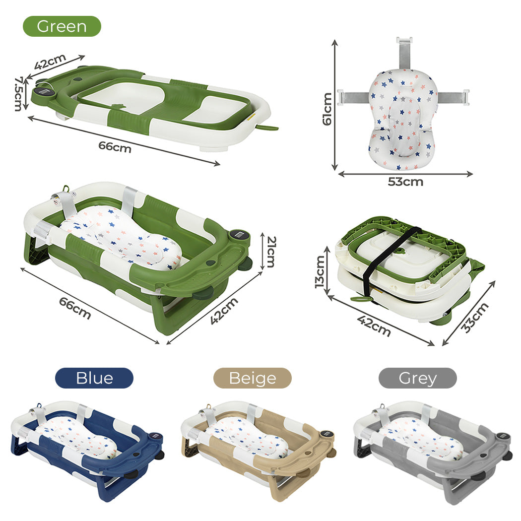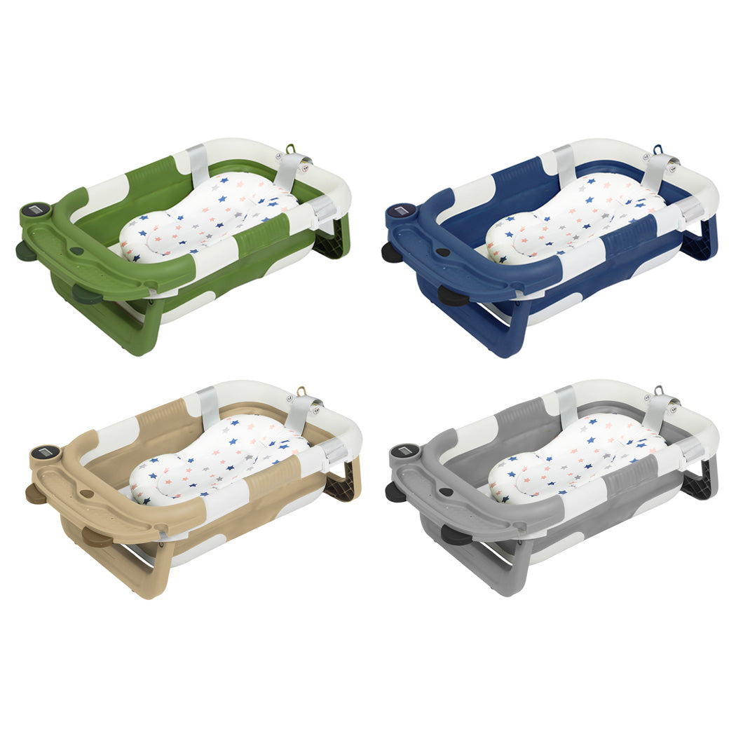 Introducing our Baby Bathtub Set, specially designed for newborns infants aged 0-15 months. This innovative bathtub features a visible temperature sensor that allows parents to monitor and adjust water temperature in real-time, preventing burns and ensuring a comfortable bath for your little one. The soft cushion pad provides gentle support to your baby’s spine, mimicking the comfort of the womb and promoting healthy spinal development. The bath mat is made from quick-drying fabric, making it easy to dry and preventing mold growth.